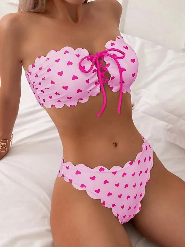 Stilvolles trägerloses Bikini-Set mit Herzmuster, gepolsterten Cups und rückenfreiem Schnitt. Perfekt für Strand und Urlaub.