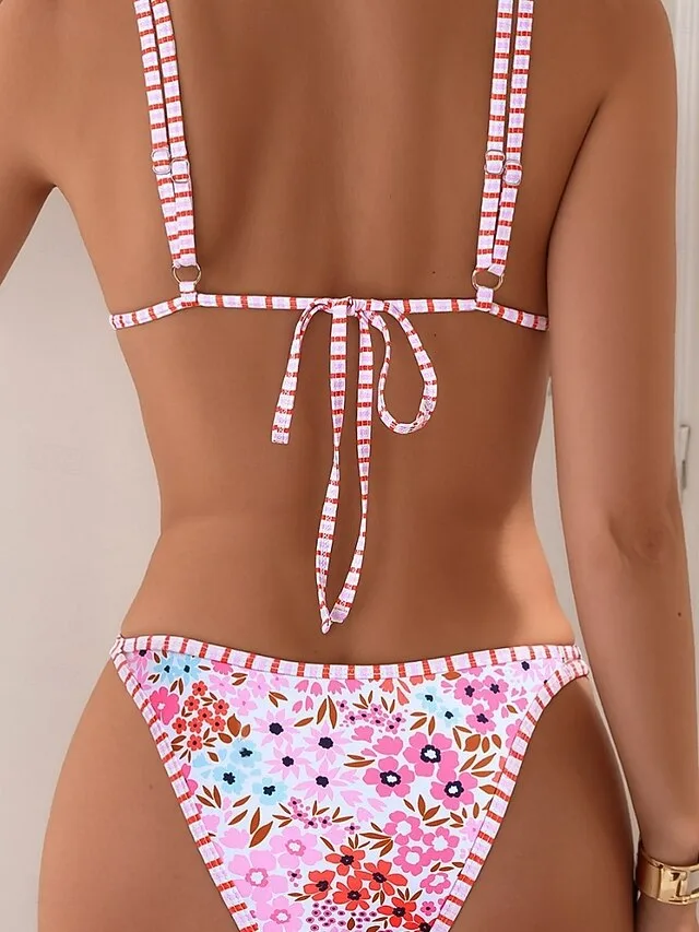 Elegantes zweiteiliges Bikini-Set mit floralem Muster, gepolsterten Cups und rückenfreiem Design. Perfekt für Strand und Urlaub.