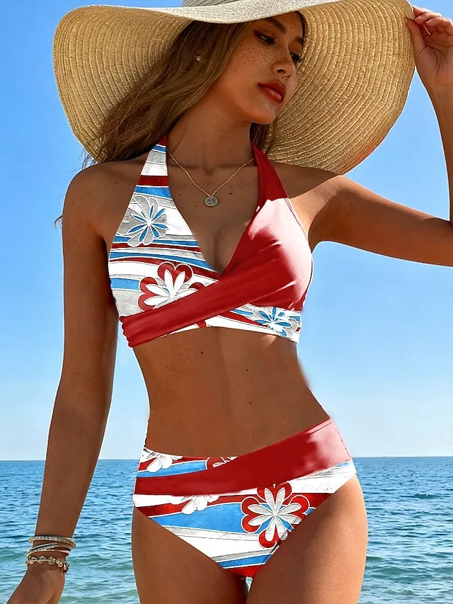 Elegantes zweiteiliges Bikini-Set mit Blumenmuster, Neckholder und rückenfreiem Design. Jetzt sommerlich stylen.