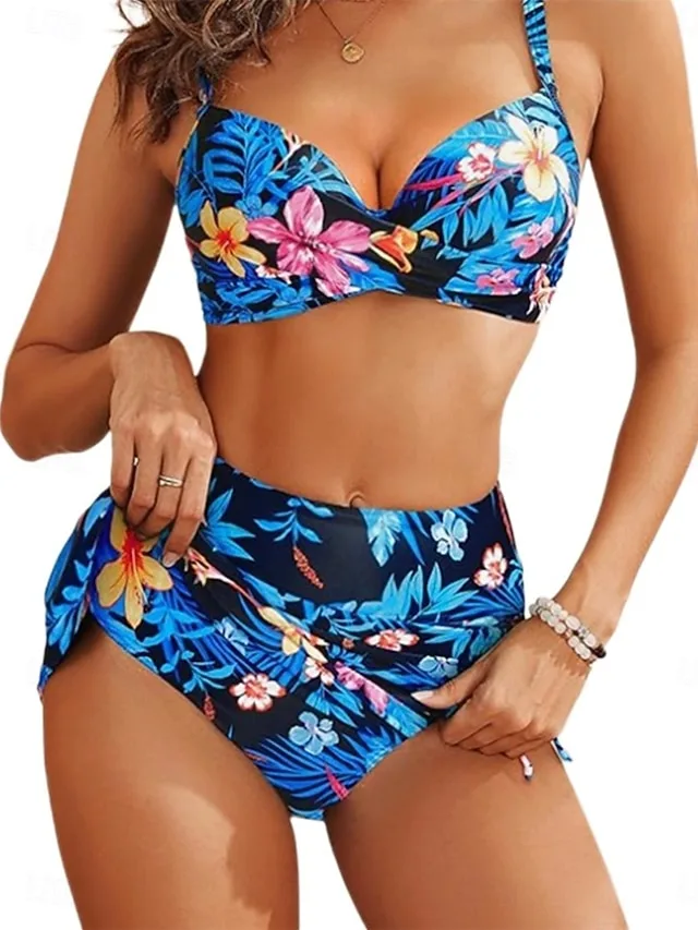 Elegantes florales Bikini-Set mit Rock, V-Ausschnitt und rückenfreiem Design. Perfekt für Strand, Pool und Urlaub.