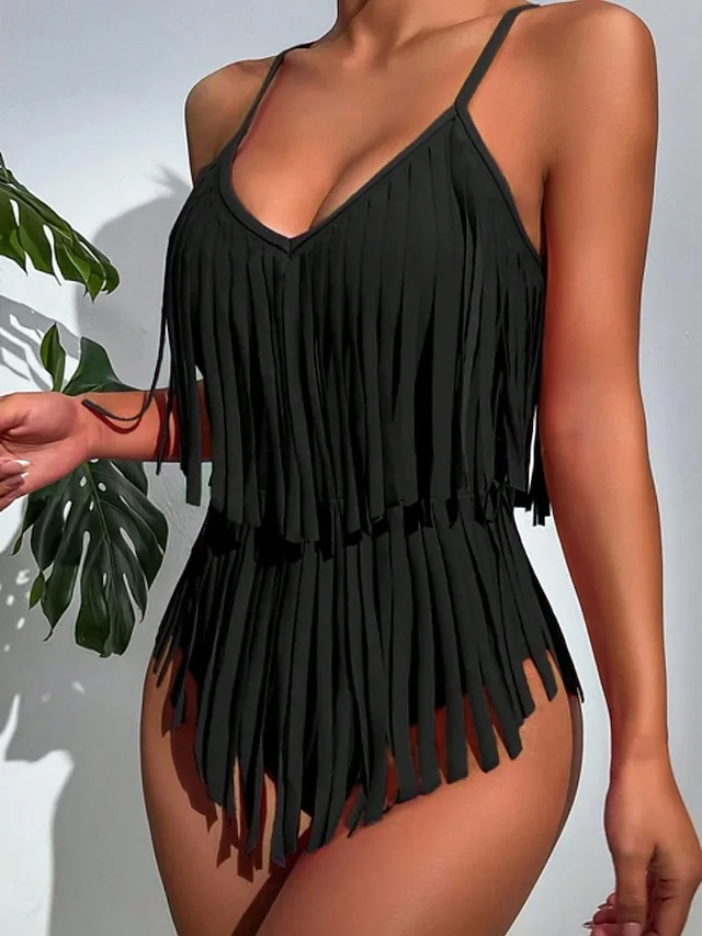 Eleganter Monokini mit Bauchkontrolle, Fransen und rückenfreiem Design. Jetzt den sommerlichen Strand-Look entdecken.