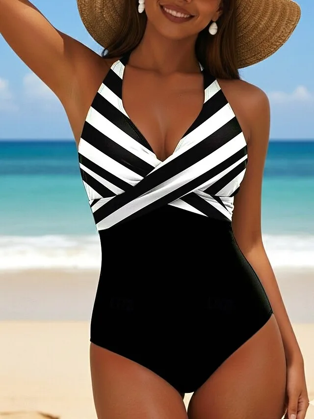 Eleganter Monokini mit Bauchkontrolle, Streifen und Rückenfrei-Design. Jetzt den stilvollen Badeanzug für Strand und Urlaub entdecken.