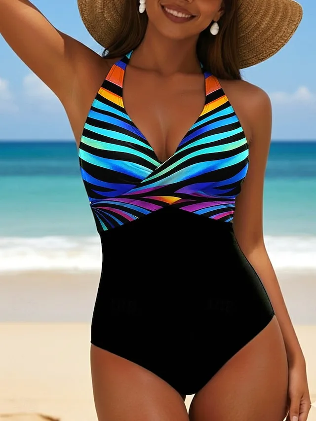 Eleganter Damen-Badeanzug mit Streifen, U-Ausschnitt und hoher Elastizität. Jetzt stilvoll für Strand und Urlaub entdecken.