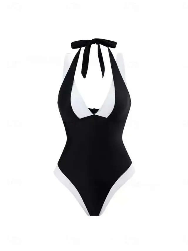 Eleganter rückenfreier Monokini mit Farbblock-Design, Neckholder und gepolsterten Cups. Jetzt stilvoll für Strand und Urlaub entdecken.