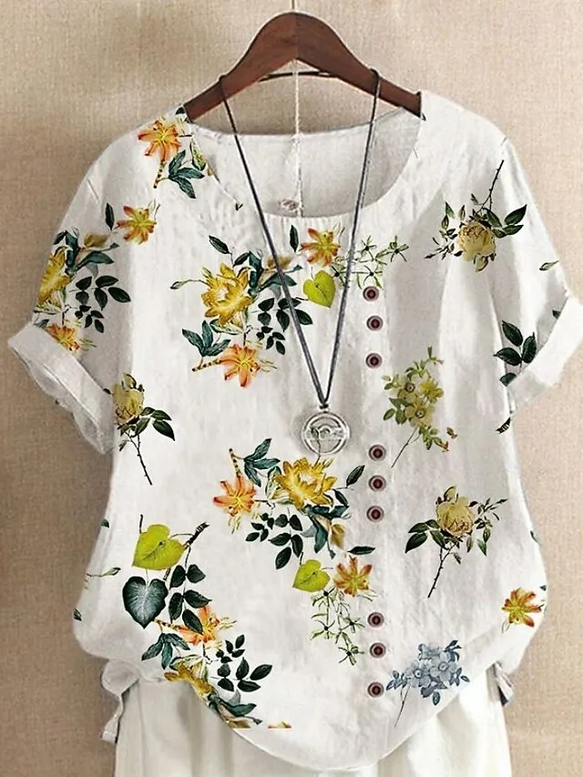 Lässige Blumenbluse mit Rundhalsausschnitt und Kurzarm. Leicht, feminin und perfekt für Alltag und Urlaub – jetzt entdecken.