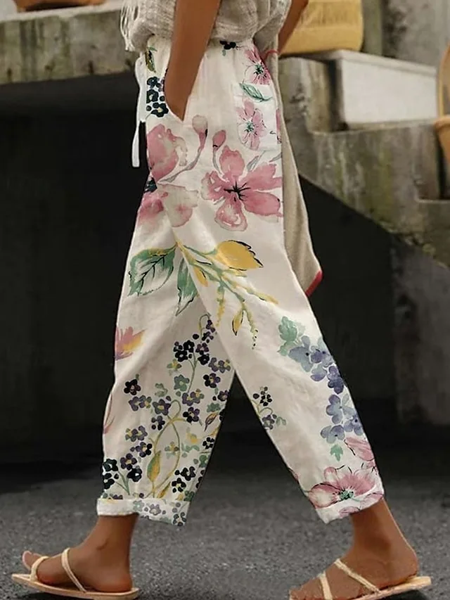 Leichte Boho-Hose mit Blumenmuster und elastischem Bund. Ideal für Frühling und Sommer – jetzt stilvoll kombinieren.