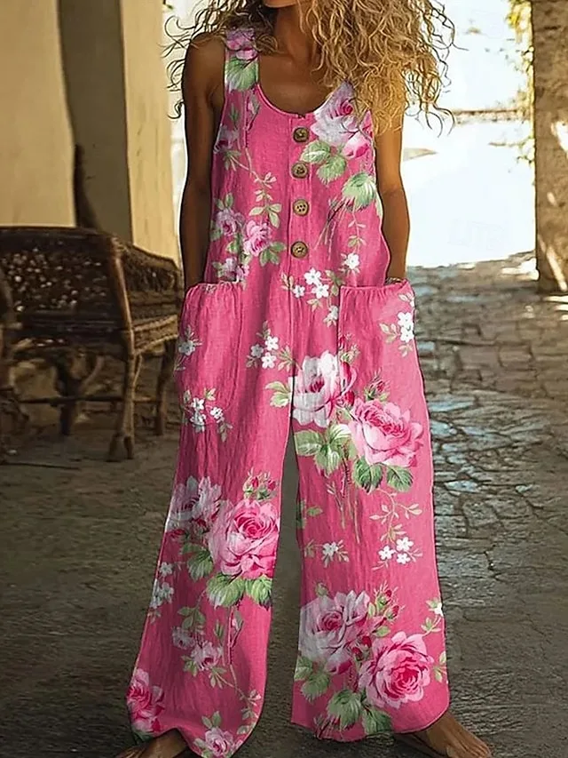 Eleganter floraler Overall mit U-Ausschnitt, weitem Bein und Taschen. Perfekt für Sommer, Alltag und Streetwear – jetzt entdecken.