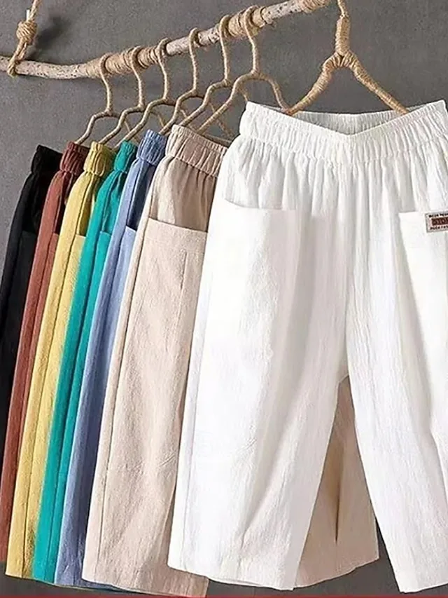 Leichte Hose aus Baumwolle und Leinen mit Kordelzug und Taschen. Bequem, atmungsaktiv und perfekt für Alltag und Wochenende.