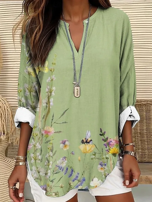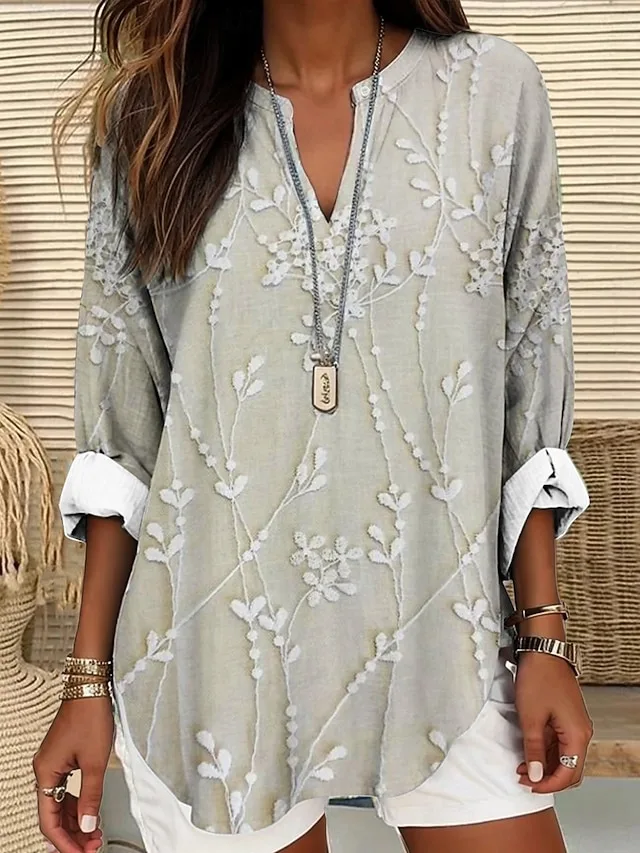 Entdecken Sie die lässige Vintage-Bluse mit Blumenprint und V-Ausschnitt. Vielseitig, bequem und stilvoll für jeden Tag.