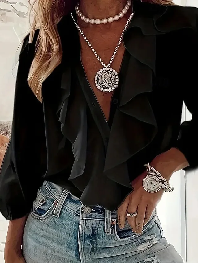 Stilvolle Bluse mit Rüschen, V-Ausschnitt und Langarm. Perfekt für Alltag, Urlaub und Ausgehen. Jetzt entdecken.