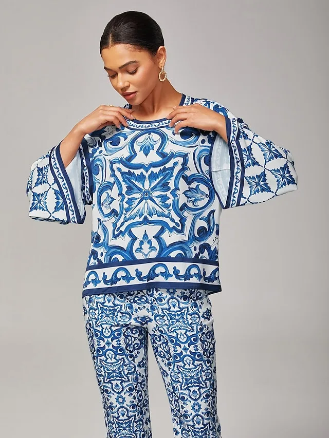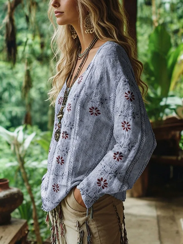 Entdecken Sie die lässige Vintage-Bluse mit Blumenprint und V-Ausschnitt. Vielseitig, bequem und stilvoll für jeden Tag.