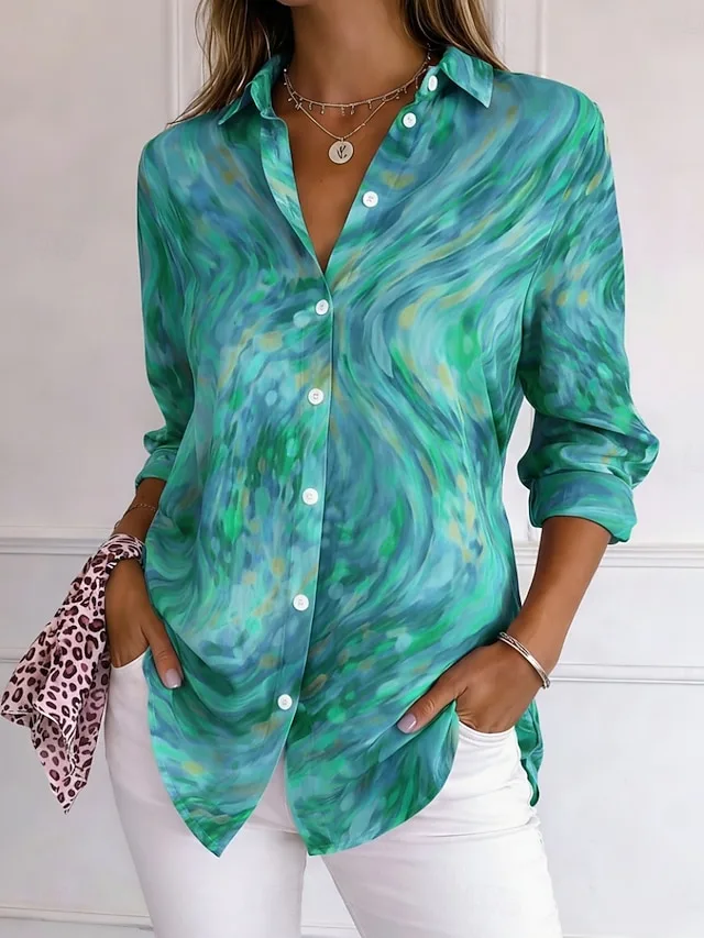 Stilvolles Damenhemd mit grafischem Farbblock-Design, normaler Passform und langem Arm. Perfekt für Alltag und Urlaub – jetzt entdecken.