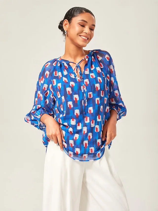 Elegante geometrische Bluse mit Puffärmeln und lockerer Passform – perfekt für stilvolle Looks im Frühling und Herbst.
