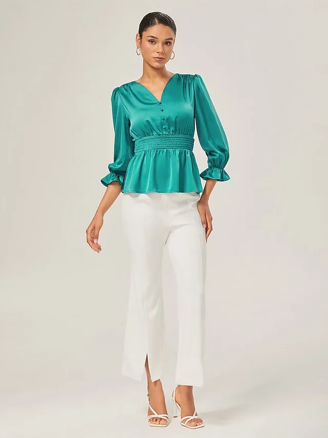 Stilvolle Satin-Bluse mit V-Ausschnitt, Puffärmeln und elastischem Bund. Perfekt für Arbeit, Urlaub und Alltag.