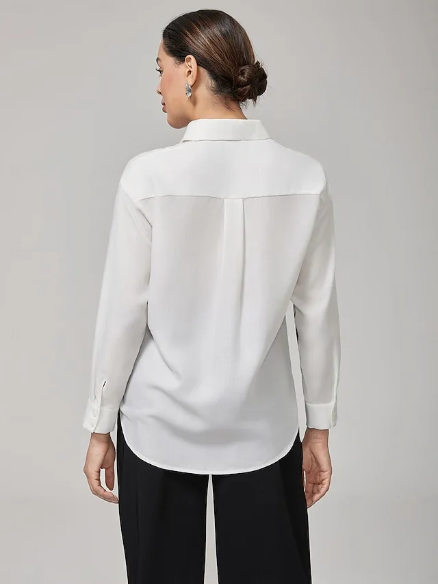 Leichte Chiffonbluse mit elegantem Hemdkragen und 3/4 Ärmeln. Perfekt für Frühling und Sommer – jetzt stilvoll kombinieren.
