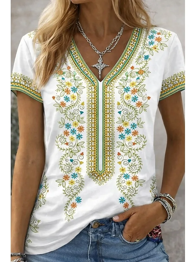Lässiges Boho T-Shirt mit Print, V-Ausschnitt und Kurzarm – perfekt für Frühling und Sommer. Jetzt stilvoll kombinieren!