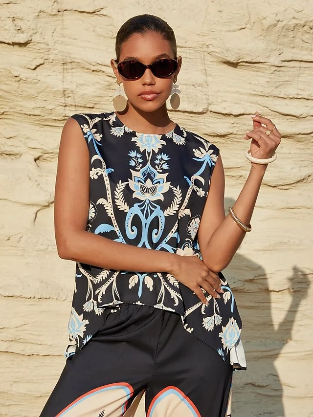 Luftiges Damen Tank Top mit floralem Grafikmuster und vielseitigem Ausschnitt. Jetzt stilvoll für Alltag und Ausgehen entdecken.
