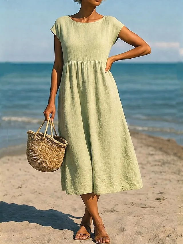 Entdecken Sie das lässige Midikleid in A-Linie mit V-Ausschnitt und Rüsche. Perfekt für Frühling und Sommer – jetzt stilvoll shoppen.