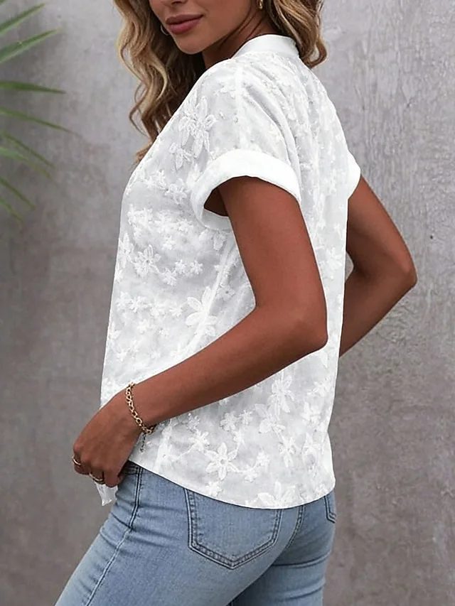 Moderne Spitzenbluse mit V-Ausschnitt und Kurzarm. Perfekt für Sommer, Ferien und Ausgehen – jetzt stilvoll entdecken.