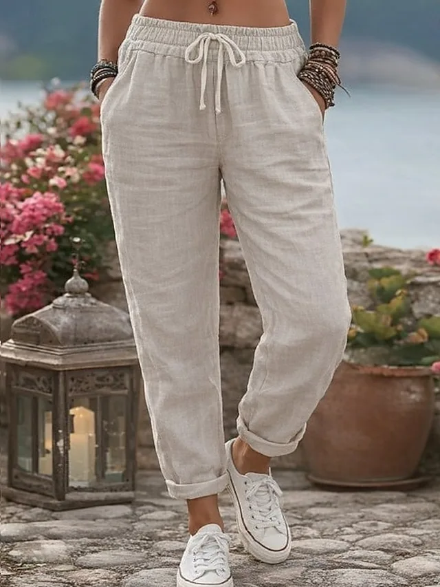 Leichte, atmungsaktive Hose mit mittlerer Taille und Kordelzug – perfekt für Urlaub, Strand und entspannte Sommertage.