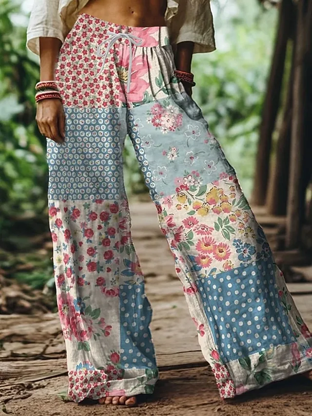 Stylische Boho-Hose mit weitem Bein, Blumen- und Grafikmuster. Weich, atmungsaktiv und perfekt für Alltag oder Urlaub. Jetzt entdecken.