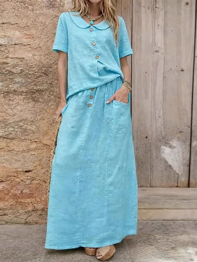 Elegantes Shirt-Set aus Baumwoll-Leinen mit Rundhals und Kurzarm. Perfekt für den Sommer – jetzt stilvoll entdecken.
