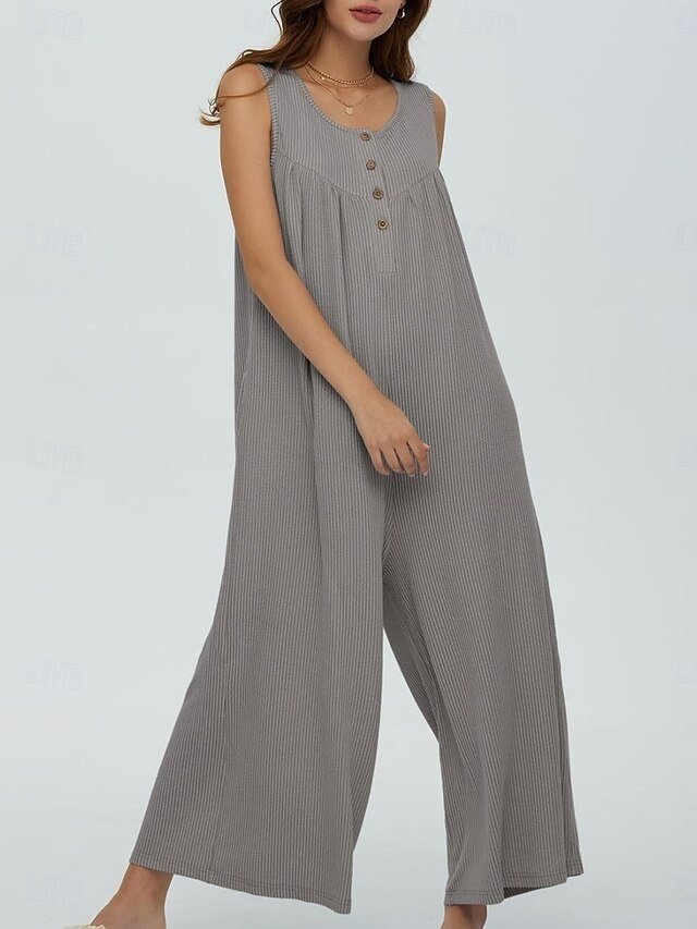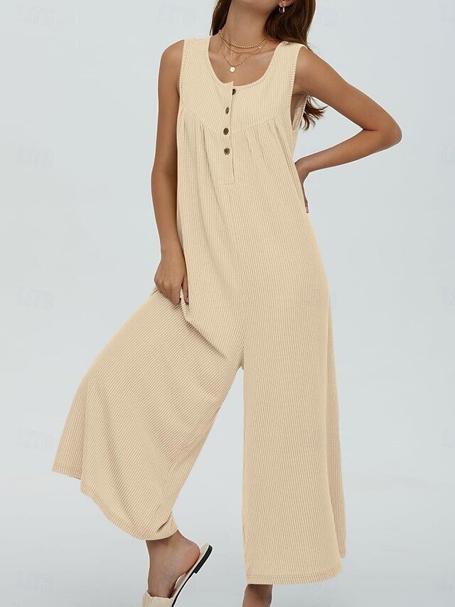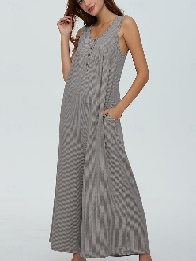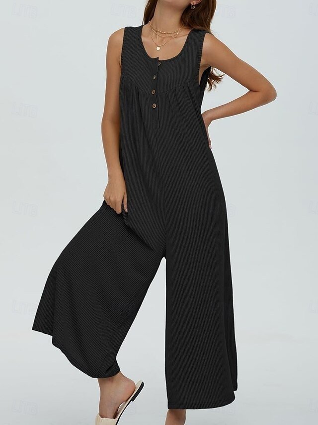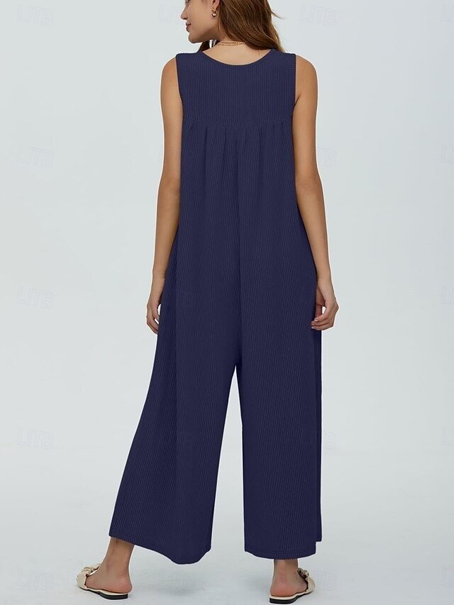 Discover chic elegance with our solid colour sleeveless jumpsuit, perfect for vacations and daily wear. Available in black, navy, and blue.