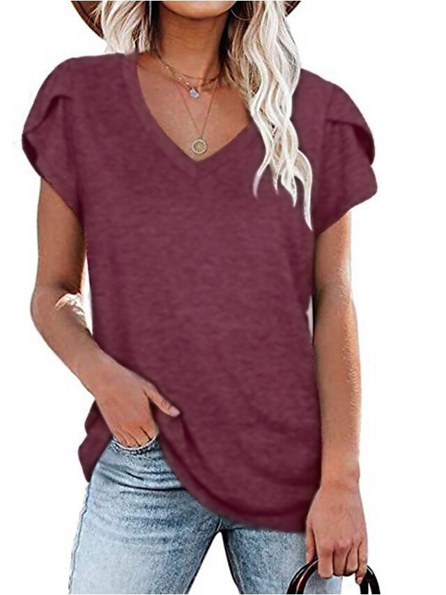 Elevate your daily ensemble with our exquisite Basic Loose Solid V Neck Short Sleeve T-Shirt. Designed for the modern woman who values both style and comfort, this versatile piece effortlessly complements any wardrobe, making it an essential staple for any occasion, from casual outings to relaxed weekends.