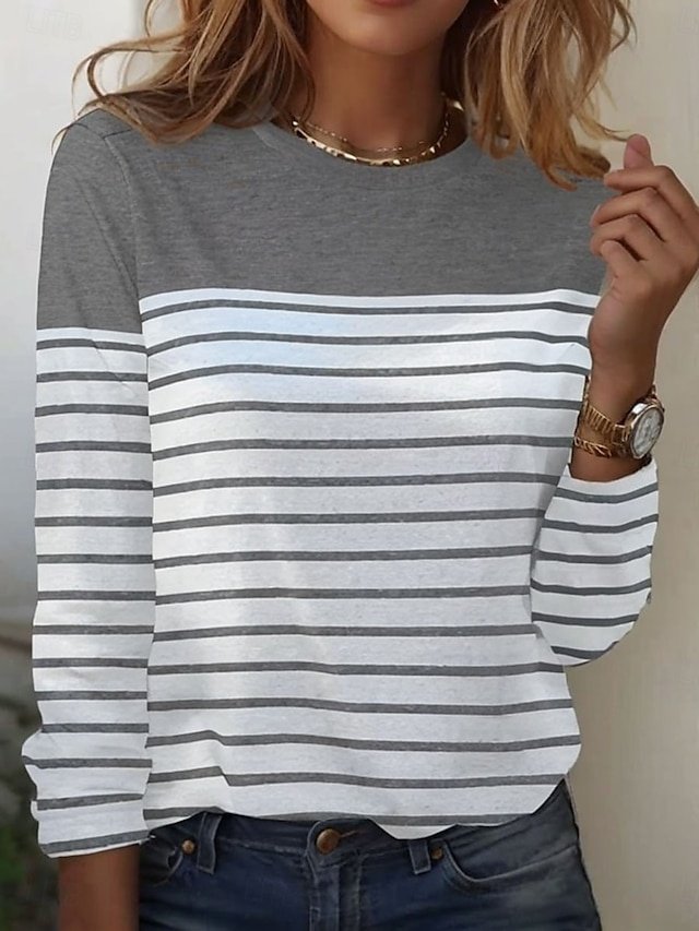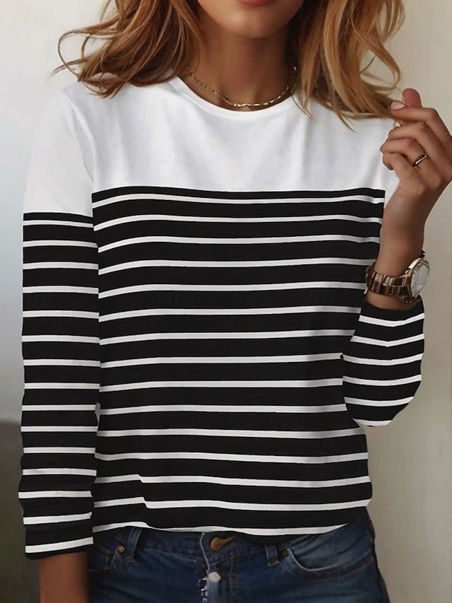 Welcome the colder seasons with sophistication and grace in our exquisite Basic Regular Striped Tops. Designed for the discerning woman who appreciates style and comfort, this piece is perfect for both daily wear and weekend outings, making it a versatile addition to your autumn and winter wardrobe.