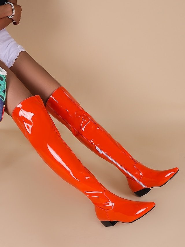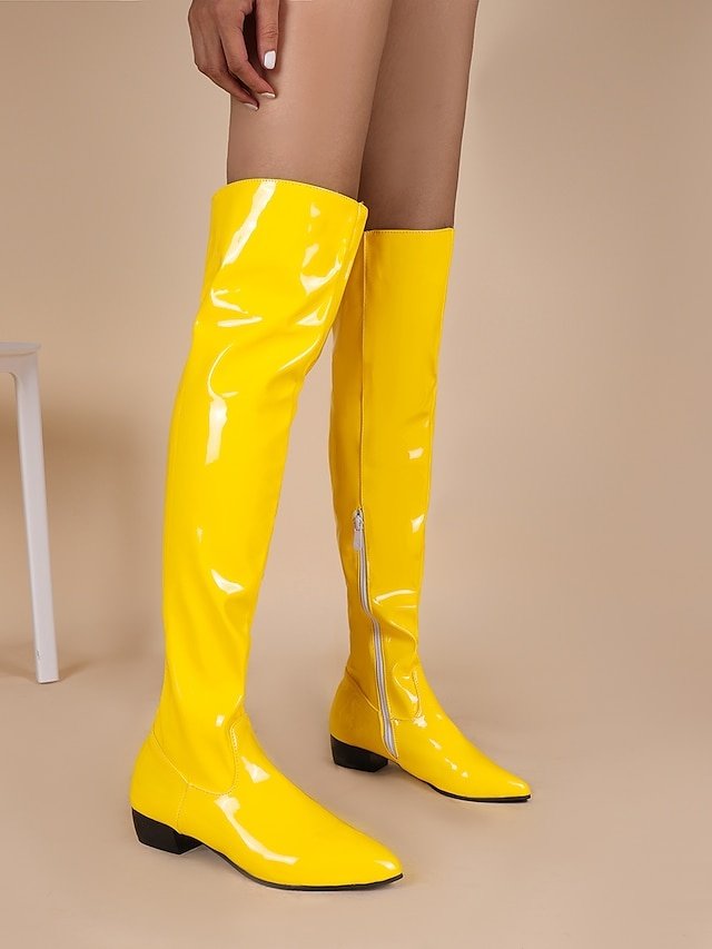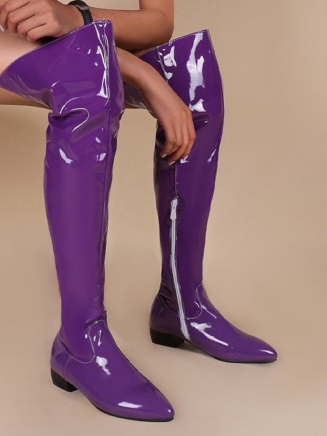 Discover sleek black patent leather over-the-knee boots, perfect for parties and fashion events. Featuring pointed toes and low heels, elevate your style.
