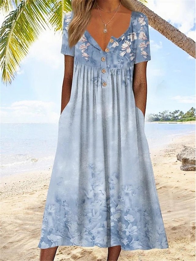 Step into the spotlight with this exquisite Blue Floral Print Midi Dress, a quintessential piece for your spring and summer wardrobe. Whether you’re gracing a beach party or enjoying a serene garden gathering, this dress promises an air of sophistication and ease.