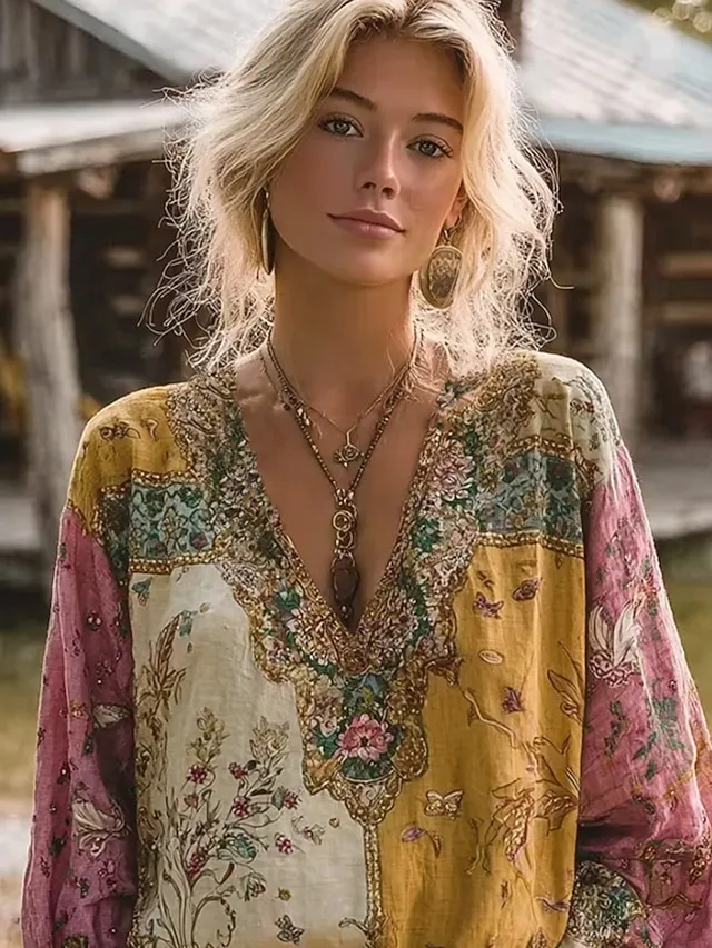 Elegante Boho-Bluse mit floralem Druck und V-Ausschnitt. Stilvoll, leicht und vielseitig für Alltag oder Urlaub. Jetzt entdecken.