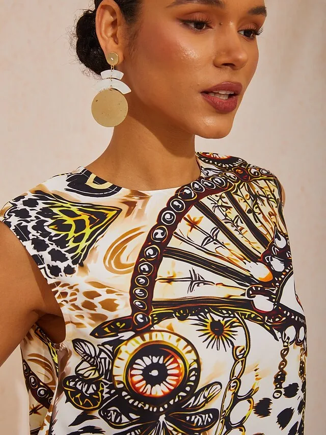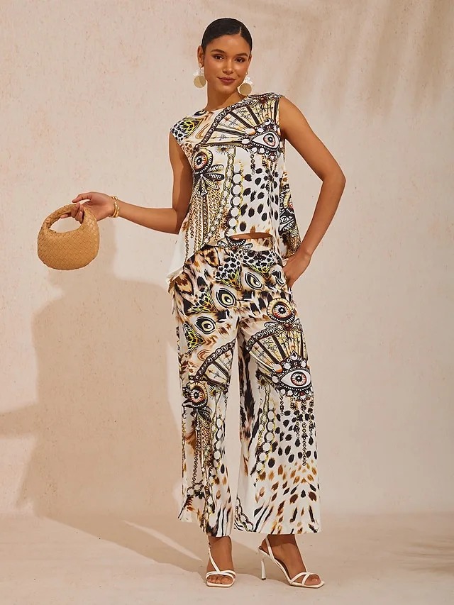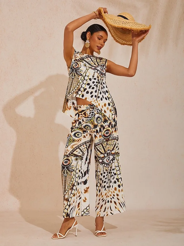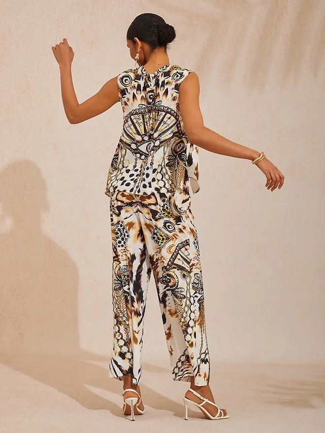 Boho Lockeres Leoparden Rundhals Ärmellos Satin Top