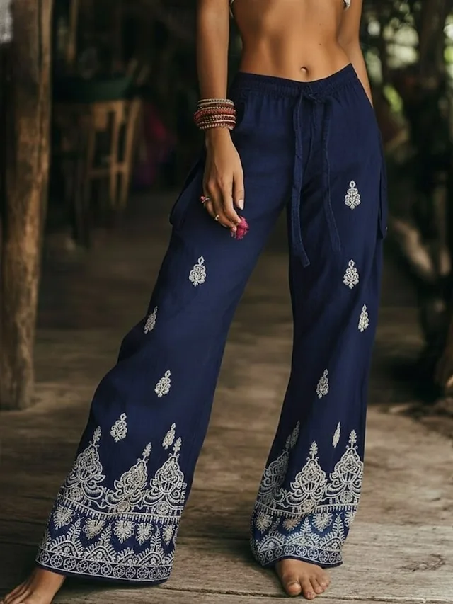 Diese weit geschnittene Hose bringt mühelose Lässigkeit und einen Hauch von Boho-Charme in Ihre Garderobe. Mit ihrer fließenden Silhouette und dem grafisch-geometrischen Print wirkt sie gleichermaßen entspannt wie stilvoll – ideal für Urlaub, Alltag und unkomplizierte Streetwear-Looks.