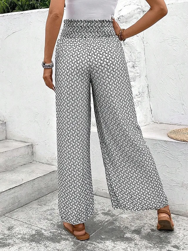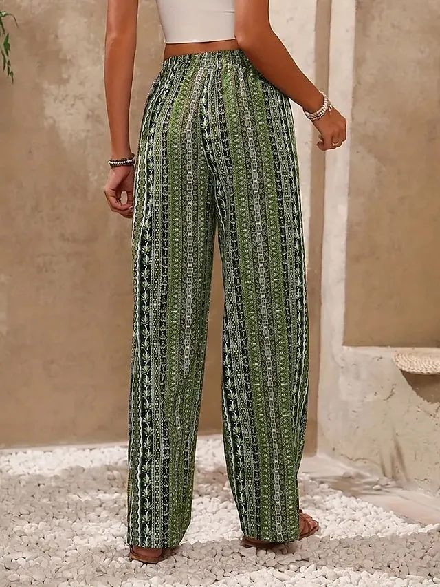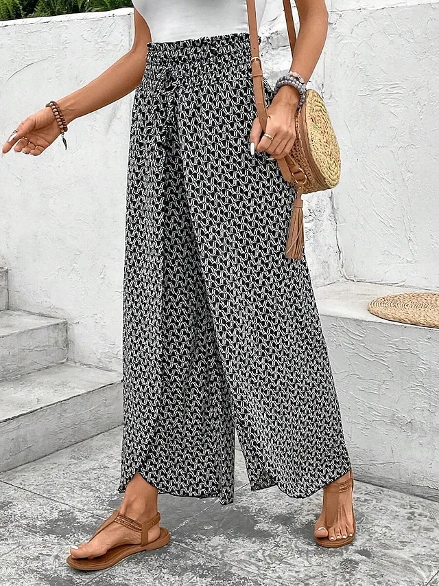 Lässige Boho-Hose mit weitem Bein, Kordelzug und grafischem Muster. Jetzt entdecken und entspannt stylen.