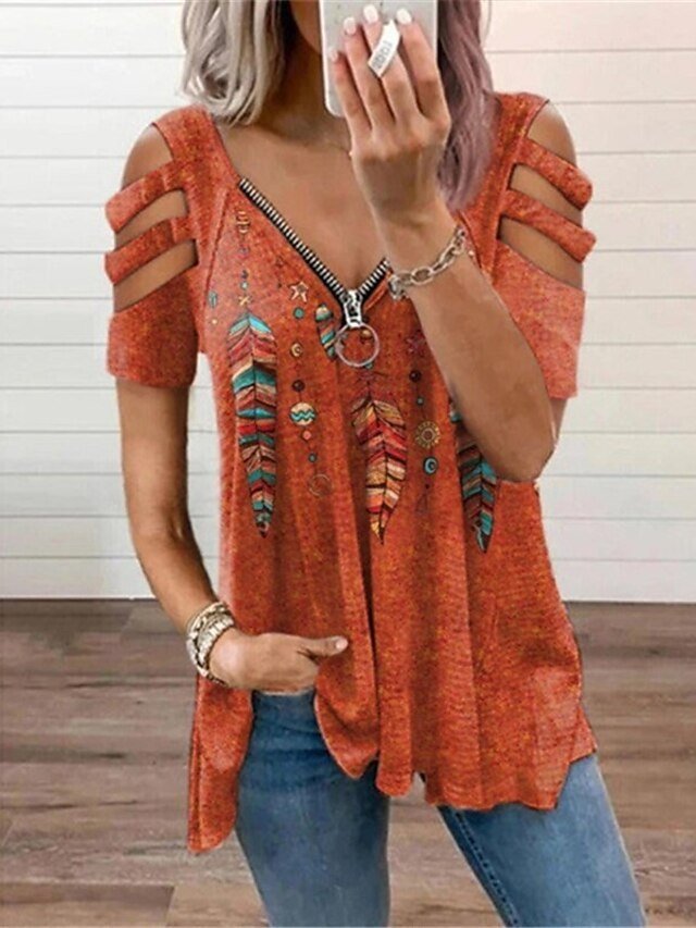Elevate your everyday wardrobe with a piece that effortlessly combines comfort and style, perfect for the modern woman. This blouse introduces a touch of elegance with its subtle feather print, designed to add a unique flair to any ensemble. The hollow-out shoulder design and V-neckline provide a contemporary aesthetic, while the zipper adds a modern twist, making it an essential addition to your casual collection.