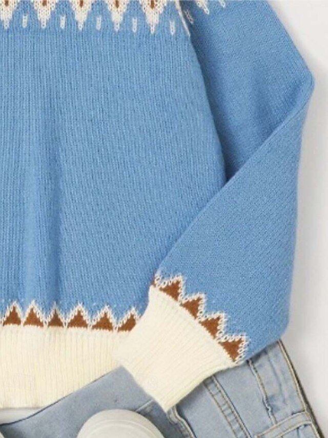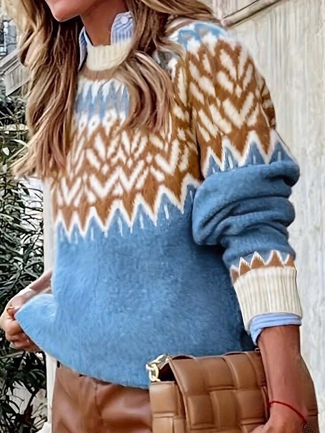 Discover our Fair Isle Geometric Crew Neck Sweater, perfect for autumn and winter outings. Embrace comfort and style in elegant blue.