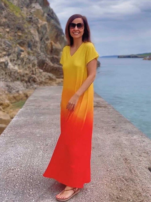 Discover the epitome of summer elegance with our Casual Loose Ombre V Neck Maxi Dress, featuring a vibrant colour gradient and luxurious fit.