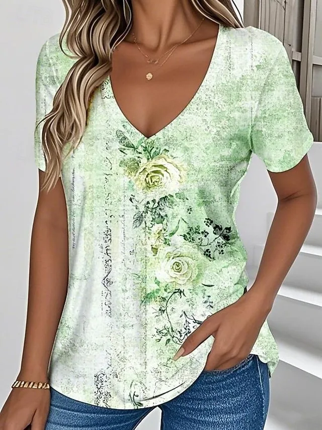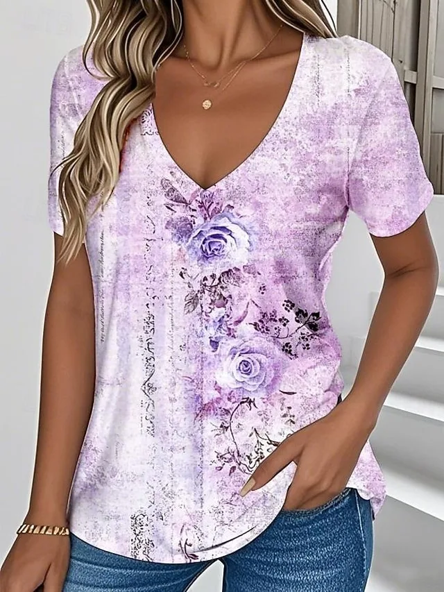 Stylisches Blumen-T-Shirt mit V-Ausschnitt und Kurzarm. Jetzt entdecken und Ihren Alltagslook elegant auffrischen.
