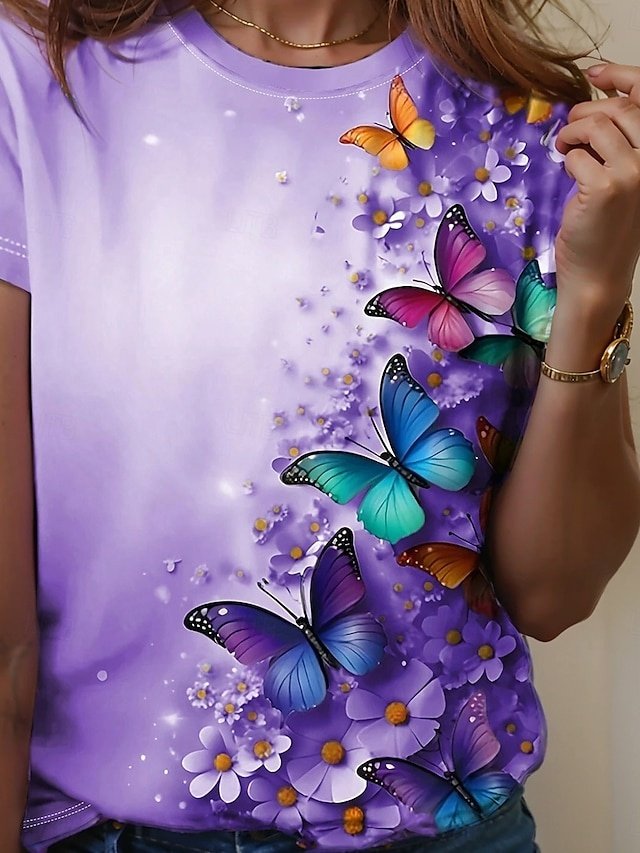 Embrace the enchanting allure of summer with our exquisite butterfly print top, designed for the modern woman who appreciates both style and comfort. This casual yet chic addition to your wardrobe features a delightful round neckline and short sleeves, perfect for those sun-drenched days and laid-back evenings.