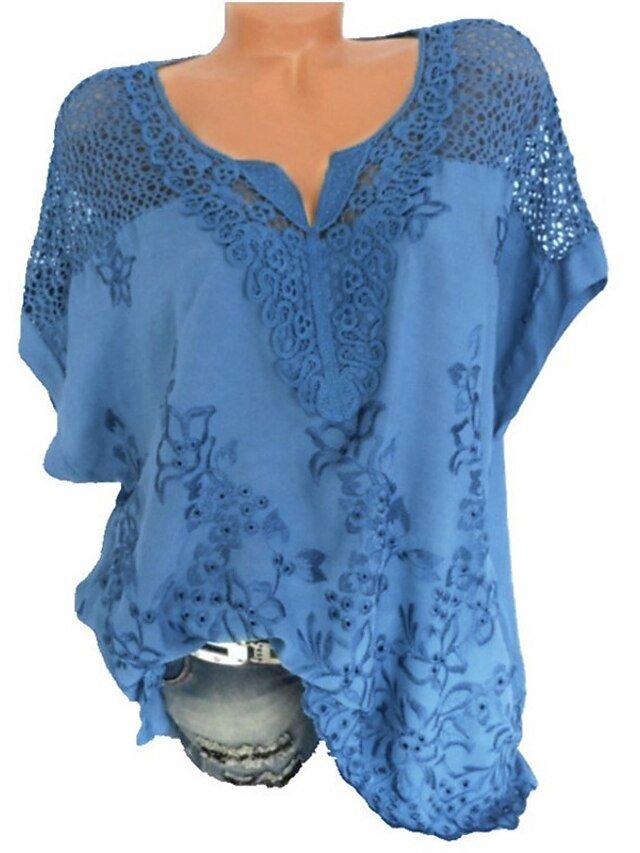 Step into a world of elegance and understated luxury with our exquisite Casual Regular Embroidered V Neck Short Sleeve Lace Blouse. This timeless piece effortlessly transitions from day to night, offering a perfect blend of sophistication and comfort for the modern woman. Revel in the delicate lace detailing and intricate embroidery, crafted to elevate your everyday wardrobe.