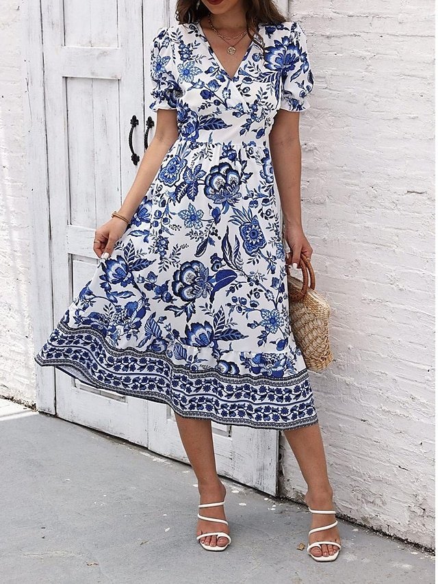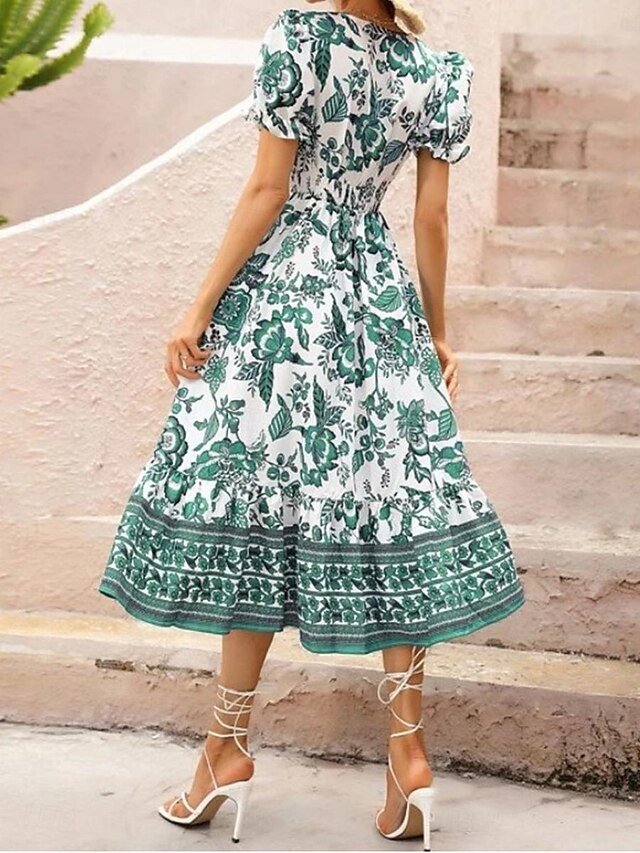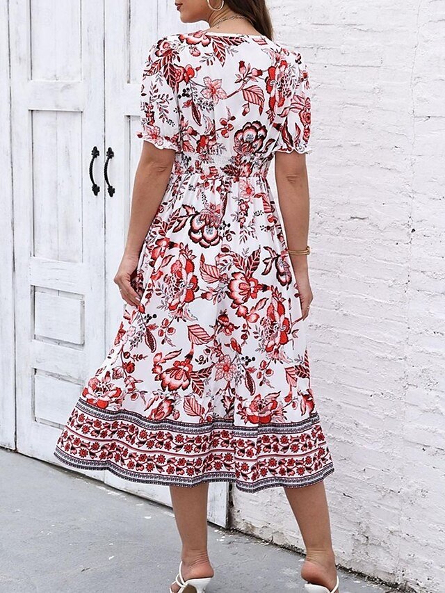Discover our Casual Regular Fit Floral V Neck Midi Dress, perfect for summer elegance in Black, Red, Blue, and Green.