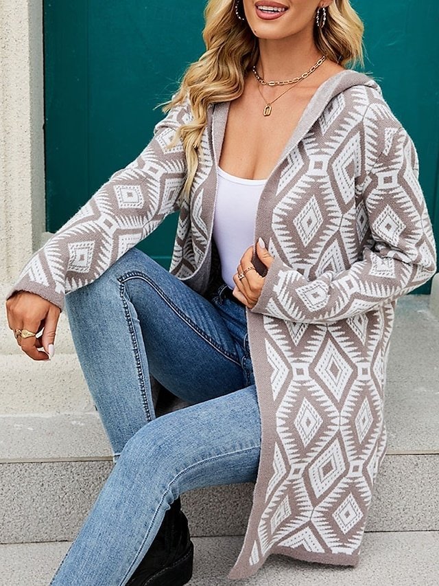 Shop our casual knit sweater with geometric paisley design, hood, and zipper. Perfect for autumn and winter outings. Available in wine red and black.