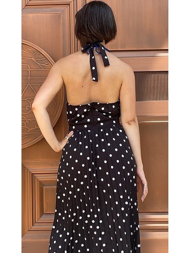 Shop our stunning Polka Dot Halter Maxi Dress. Perfect for beach vacations or daily wear. Available in Green, Black, Blue. Sizes S to XL.