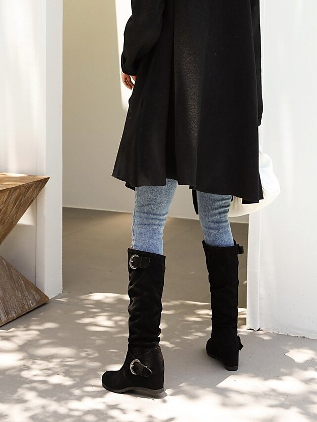 Discover our stylish black slouchy faux suede knee-high boots with buckle straps. Perfect for chic autumn and winter outfits.