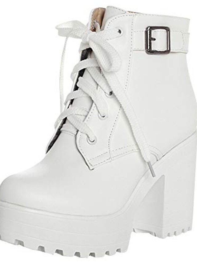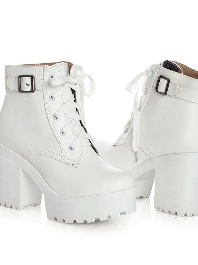 Discover elegance with chic ankle platform lace-up block heel boots in black & white. Perfect for the modern woman’s wardrobe.