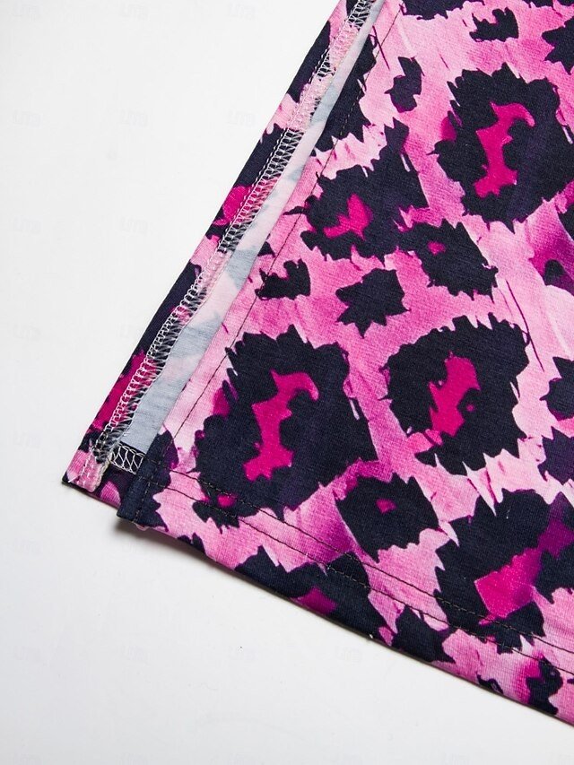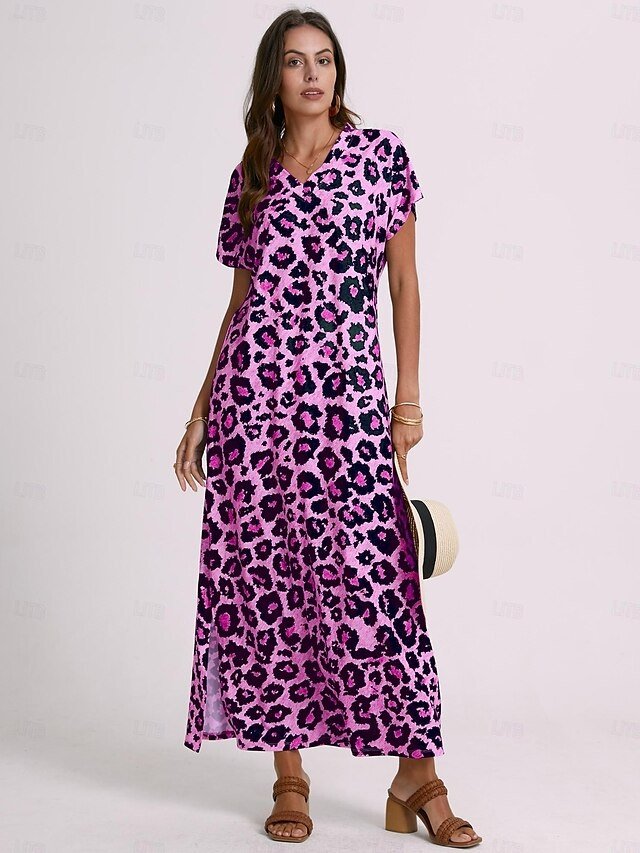 Chic Regular Fit Leopard V Neck Drop Shoulder Short Sleeve Maxi Dress