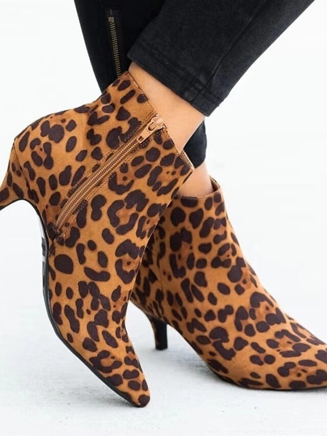 Shop elegant black faux suede ankle boots with leopard pattern. Perfect for office and evening wear. Available in plus sizes.