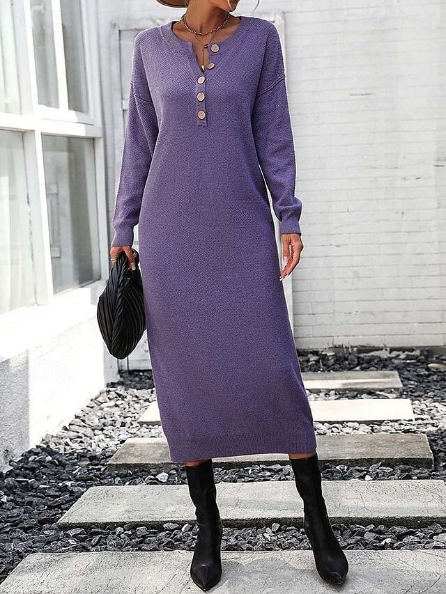 Discover sophistication with our Elegant Casual Solid Crew Neck Long Sleeve Sweater Dress in Black and Purple. Perfect for fall and winter.