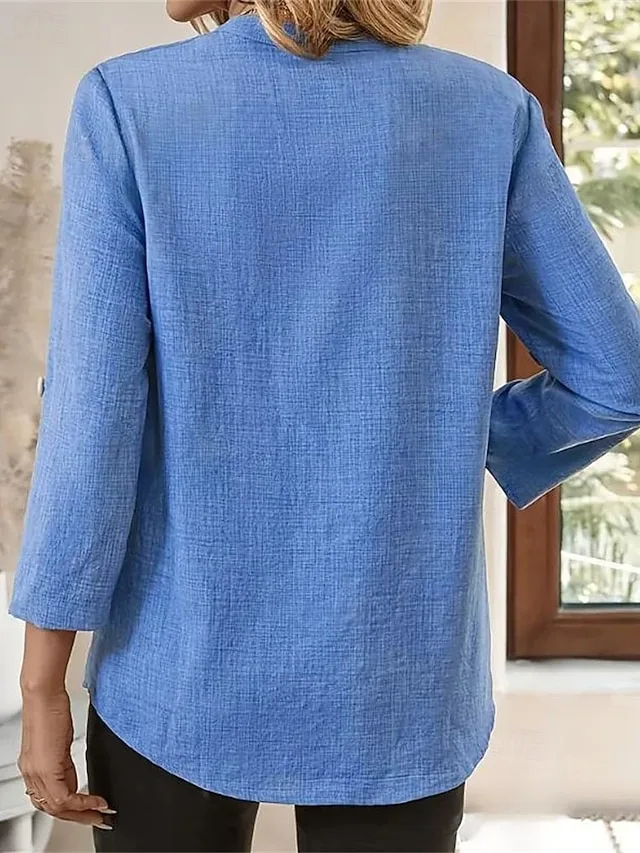 Stilvolle Baumwoll-Leinen-Bluse mit Hemdkragen und Dreiviertelarm. Perfekt für Alltag, Büro und elegante Casual-Looks. Jetzt entdecken.